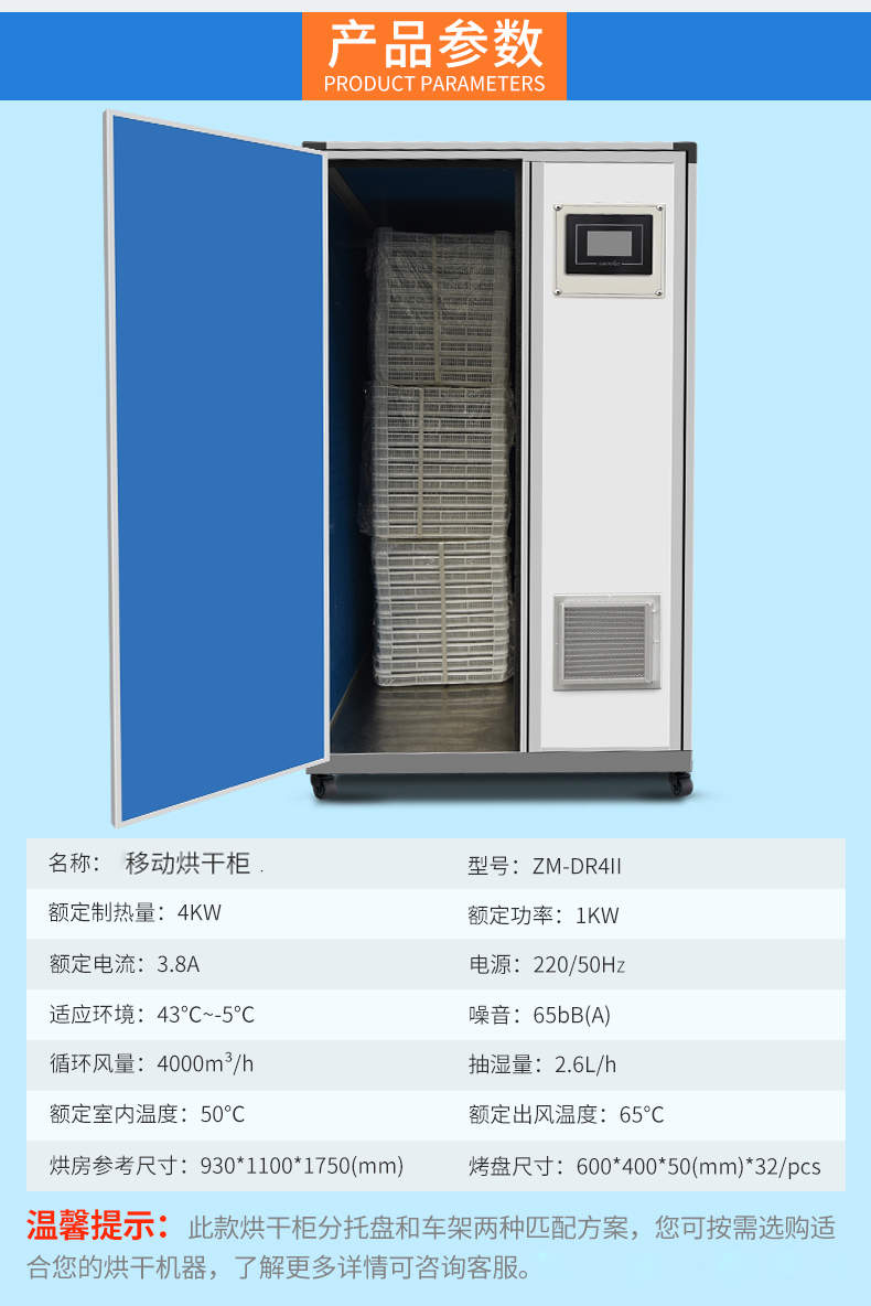 名稱烘干抽濕一體機(jī)(帶烘房) 電源220/50Hz 功率1KW 產(chǎn)量循環(huán)風(fēng)量:4000m3/h、抽濕量:2.6L/h 尺寸烘房參考:930*11001750(mm)、烤盤:600*400*50(mm)*32/pcs 重量聯(lián)系銷售員 規(guī)格額定室內(nèi)溫度:50°C、額定出風(fēng)溫度:65°C 其他適應(yīng)環(huán)境:43°C~5°C、噪音:65bB(A)