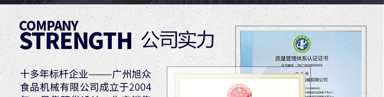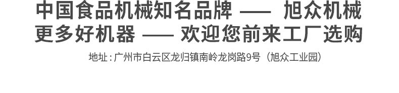 廣州旭眾食品機(jī)械有限公司是一家集科研開發(fā),生產(chǎn)設(shè)計,營銷服務(wù)為一體的現(xiàn)代化生產(chǎn)企業(yè)?,F(xiàn)代化生產(chǎn)車間,精湛制造技術(shù),所產(chǎn)機(jī)械歷經(jīng)市場重重考驗,不斷贏得海內(nèi)外客戶的贊譽(yù)。