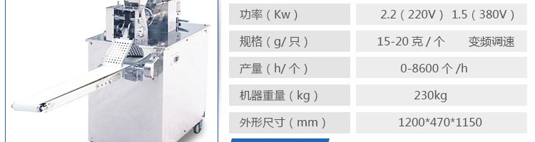 名稱JGB-120-5A型輸送帶餃子機(jī) 電源220/380V(見機(jī)器名牌) 功率2.2kw(220V)1.5KW(380V) 產(chǎn)量0-8600個(gè)/小時(shí) 尺寸外形尺寸1500*460*1190mm 重量230kg 規(guī)格15-20克/個(gè) 其他