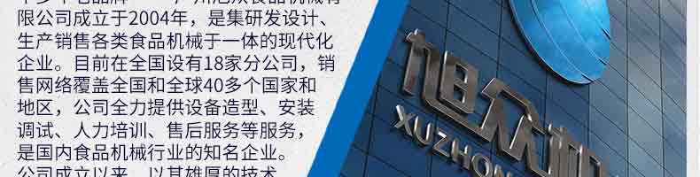 廣州旭眾食品機械有限公司是一家集科研開發(fā),生產(chǎn)設(shè)計,營銷服務(wù)為一體的現(xiàn)代化生產(chǎn)企業(yè)?,F(xiàn)代化生產(chǎn)車間,精湛制造技術(shù),所產(chǎn)機械歷經(jīng)市場重重考驗,不斷贏得海內(nèi)外客戶的贊譽。