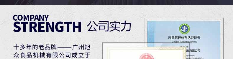廣州旭眾食品機械有限公司是一家集科研開發(fā),生產(chǎn)設(shè)計,營銷服務(wù)為一體的現(xiàn)代化生產(chǎn)企業(yè)?,F(xiàn)代化生產(chǎn)車間,精湛制造技術(shù),所產(chǎn)機械歷經(jīng)市場重重考驗,不斷贏得海內(nèi)外客戶的贊譽。