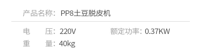 名稱(chēng)PP8、PP15薯仔脫皮機(jī) 電源220v 功率0.37kw/0.75kw 產(chǎn)量8千克/次 / 15千克/次 尺寸480*480*780mm/500*500*860mm 重量52kg/66kg 規(guī)格 其他