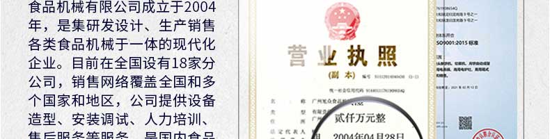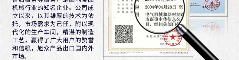 廣州旭眾食品機(jī)械有限公司是一家集科研開(kāi)發(fā),生產(chǎn)設(shè)計(jì),營(yíng)銷服務(wù)為一體的現(xiàn)代化生產(chǎn)企業(yè)?,F(xiàn)代化生產(chǎn)車間,精湛制造技術(shù),所產(chǎn)機(jī)械歷經(jīng)市場(chǎng)重重考驗(yàn),不斷贏得海內(nèi)外客戶的贊譽(yù)。