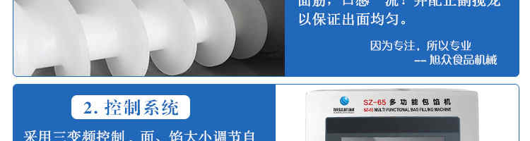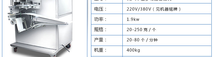 名稱SZ-65型多功能自動包餡機 電源220/380V 功率1.9kw 產(chǎn)量20-80個/分鐘 尺寸1130*920*1650mm 重量400kg 規(guī)格20-250克/個 其他皮餡比例2:8 5:5